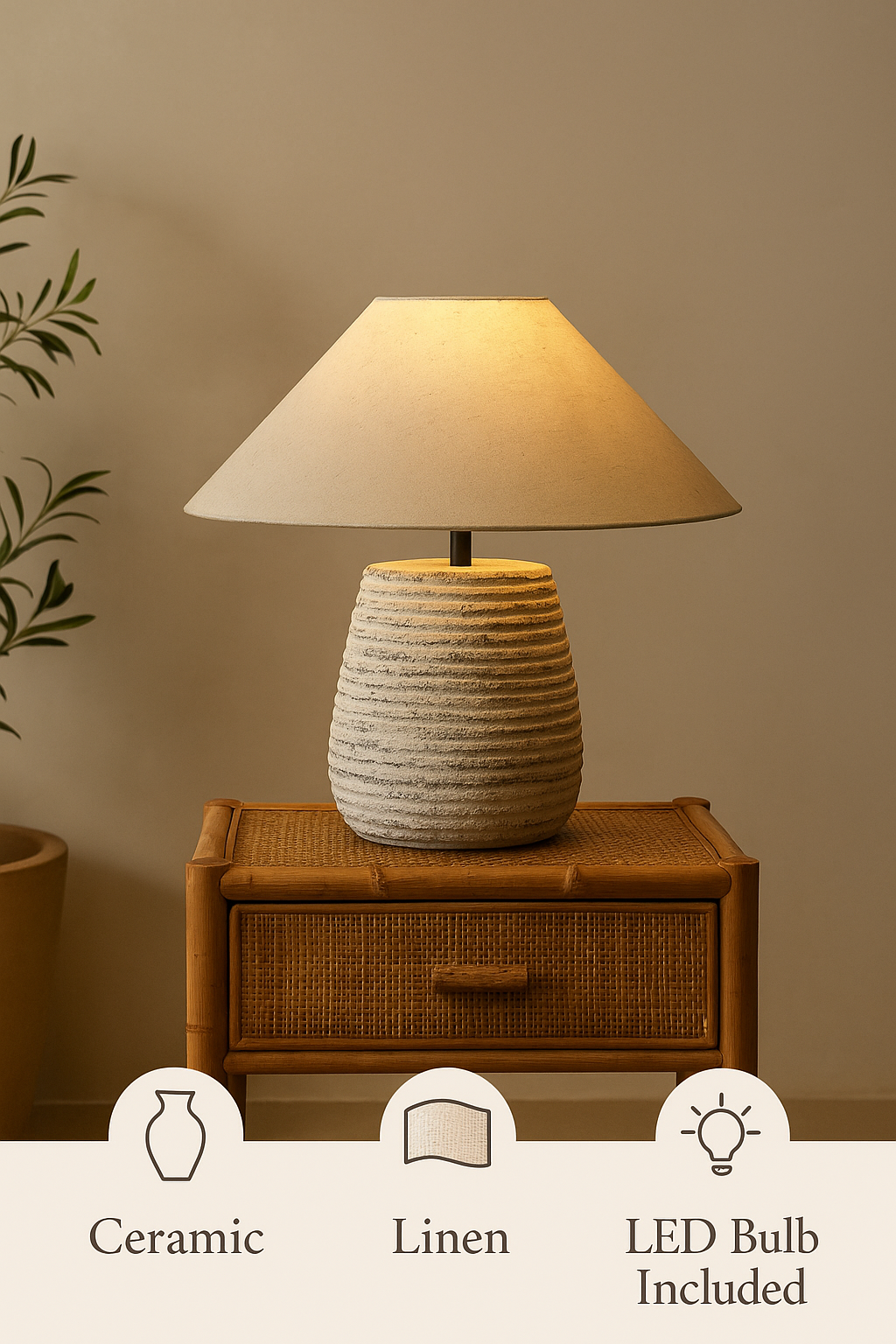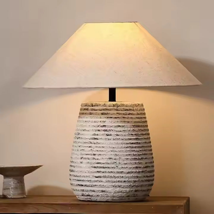 Add warmth, texture, and a touch of artisan charm to your space with this beautifully crafted Japandi Table Lamp. Featuring a ribbed ceramic base that mimics hand-thrown pottery and a soft linen cone shade, this piece is both grounding and refined.